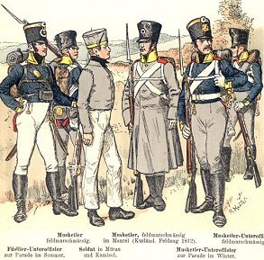 The line infantry included musketiers and grenadiers. The line infantry made the bulk of the army. For example in 1806 there were 147 battalions of line infantry (120 musketier and 27 grenadier) in comparig to only 27 battalions of light infantry (24 fusilier and 3 jägers). The average height of Prussian infantryman (in 1811) was 1.63 cm. The minimum height for the recruits was 157 cm but for the guard was 175 cm. "The grenadiers (and guardsmen) were the tallest, although probably the tallest musketeers will have been a bit taller than the shortest grenadiers. Prussian Fusiliers should have been the smallest and most agile men of the regiment, but in fact, they were just the smallest..." (- Oliver Schmidt)