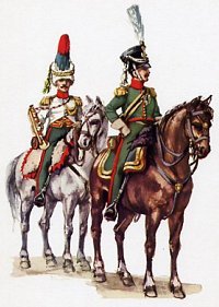 The chasseurs-a-cheval wore dark green coat (kurtka) with yellow buttons and dark green breeches. The boots were below knee. The men of elite company in every regiment wore black busbies/colpacks with a bag in regimental color. Red plume and red cords were attached to the headwear. The men of center companies wore shako with metal plaque and white cords. The plume was in regimental color (tipped with dark green). The senior officers distinguished themselves with white plumes and silver cords.